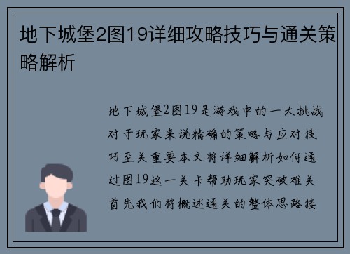 地下城堡2图19详细攻略技巧与通关策略解析
